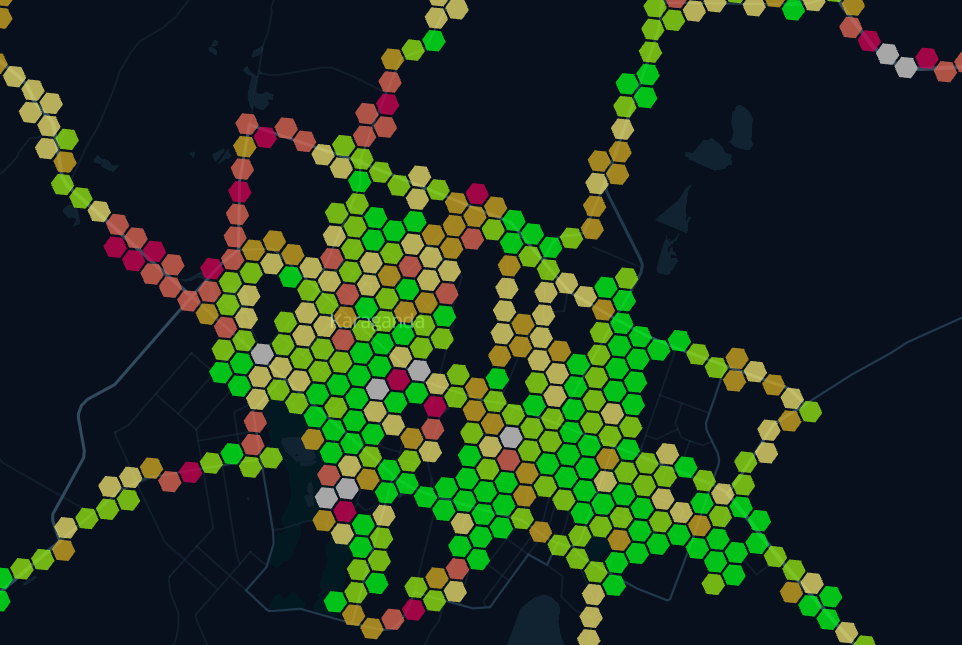 Система мониторинга связи непрерывно собирает данные о качестве мобильного покрытия через пользовательские приложения. Интерактивная карта в реальном времени отображает уровень сигнала — от высокого до отсутствующего — для каждой зоны. Это позволяет оперативно анализировать и отслеживать качество связи по всему городу.
